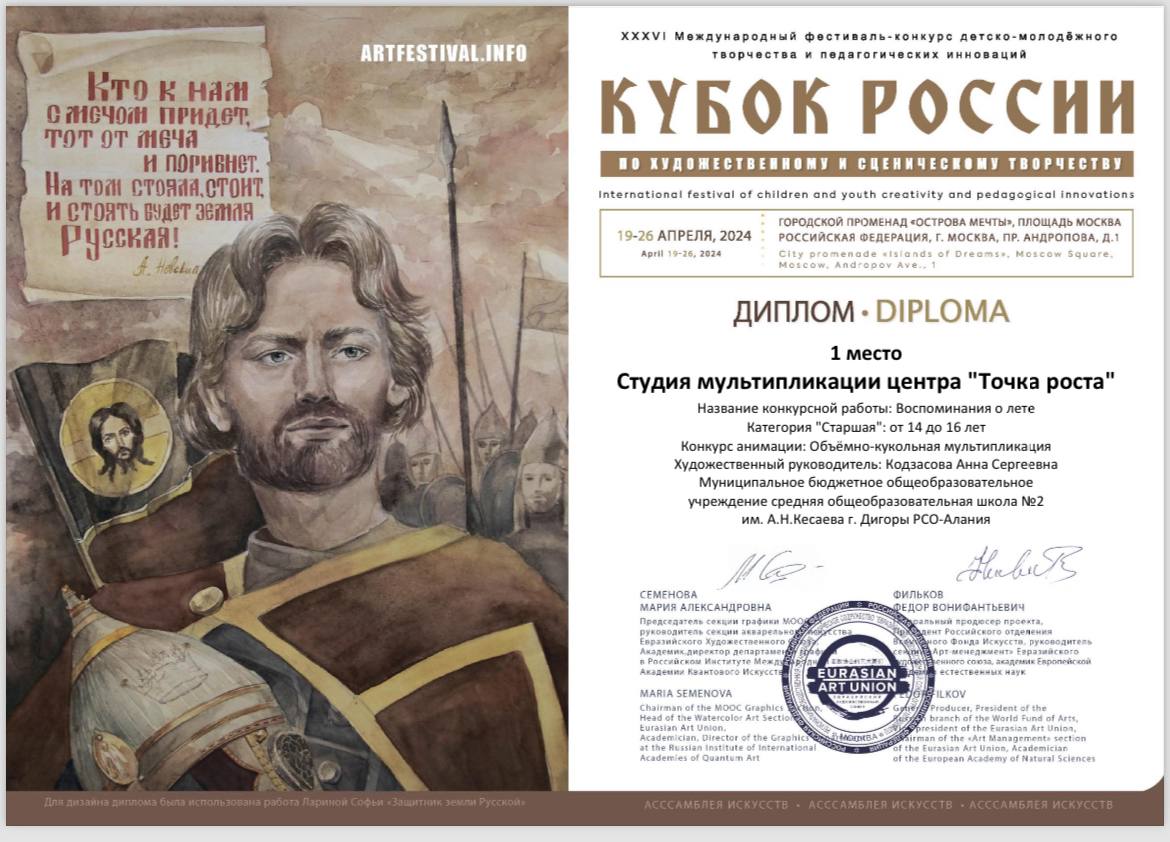 ⚪️Мультипликационные фильмы, созданные обучающимися МБОУ СОШ №2 г.Дигоры неоднократно становятся победителями и призерами на Всероссийском фестивале «Кубок России – Ассамблея искусств».